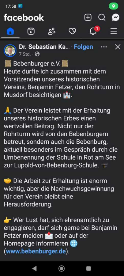 Einige Mitglieder der Denkmalstiftung hatten sich im März 2015 inkognito angesehen. Hermann Vogler bestätigte, dass es sich bei dem Rohrturm um einen heimatkundlich interessanten Punkt handelt. Wenngleich es Zweifel gab, ob die Bebenburger das Projekt umsetzen kann. Nachdem das Finanzierungskonzept nochmals überarbeitet wurde, sieht er die Bebenburger auf einem guten Weg. Auch der Bürgermeister Siegfried Gröner steht hinter den Bebenburgern.